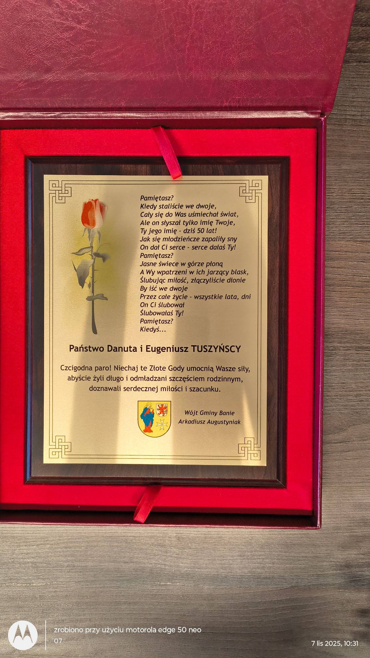 W dniu 7 listopada 2025 r. w Urzędzie Gminy w Baniach odbyła się uroczystość poświęcona pięknemu Jubileuszowi 50-lecia pożycia małżeńskiego, który obchodzili Państwo Danuta i Eugeniusz Tuszyńscy.