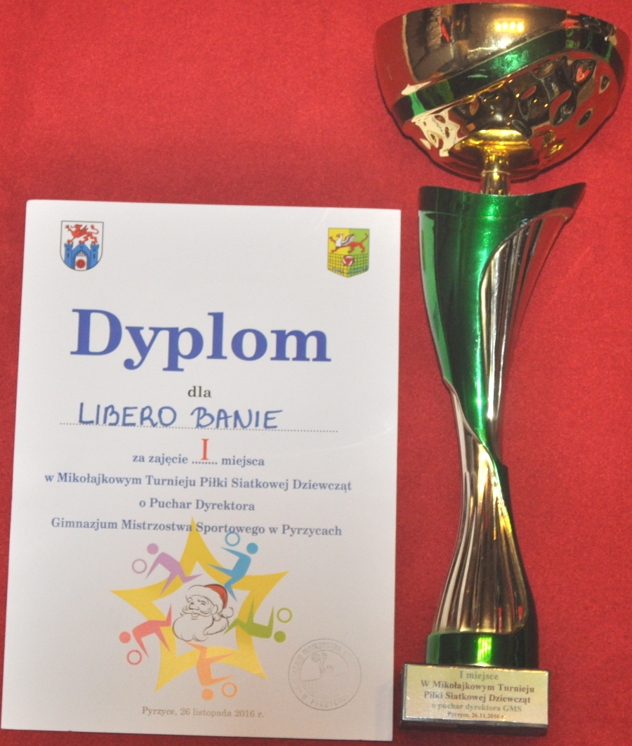 Puchar Dyrektora Mistrzostwa Sportowego w Pyrzycach pojechał do Bań. Cztery zwycięstwa odniosły siatkarki LIBERO Banie i zajęły pierwsze miejsce w Mikołajkowym Turnieju Piłki Siatkowej w Pyrzycach. W zawodach wzięły udział drużyny z Wałcza, Gryfic, Stargardu, Pyrzyc, Szczecina i Bań. Dobrze dysponowane tego dnia nasze dziewczęta nie pozwoliły na wiele swoim rywalkom zwyciężając 2:0 zespołami LIBERO Wałcz II, LO Pyrzyce, BUKOWE 29 Szczecin i PLAS Gryfice. Na dobrym poziomie zagrały nasze młodziczki wspomagane starszymi koleżankami z klasy III gimnazjum. Wyróżnienie indywidualne otrzymała środkowa LIBERO Banie Katarzyna Dwilińska, która swoją zagrywka siała spustoszenie na polu przeciwników.