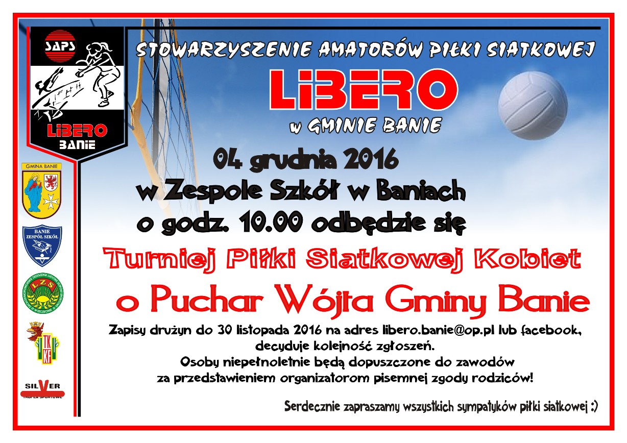 W Ogólnopolskim Turnieju Piłki Siatkowej Młodziczek z okazji Święta Niepodległości wzięły udział drużyny BETA Błonie, ENERGETYK Poznań (dwa zespoły), POMORZANIE Szczecin, OLIMP Września, WRZOS Międzyborów, WOLA Warszawa, SIEDEMNASTKA Kalisz, MORENA Miastko, GLKS NADARZYN, Kadra Wielkopolski (dwa zespoły), LIBERO Banie oraz gospodarz ŚRODA Środa Wielkopolska. Osiem spotkań w ciągu dwóch dni rozegrały młodziczki z Bań. Turniej rozpoczął się odśpiewaniem "Mazurka Dąbrowskiego" z okazji Narodowego Święta Niepodległości. Wiele drużyn to uczestnicy szczebla centralnego rozgrywek młodzieżowych m.in. finaliści Mistrzostw Polski. Nasze dziewczęta z każdym meczem grały coraz lepiej. Ostatecznie dziewczęta po niezłej grze zajęły dziesiąte miejsce wśród czternastu ekip.