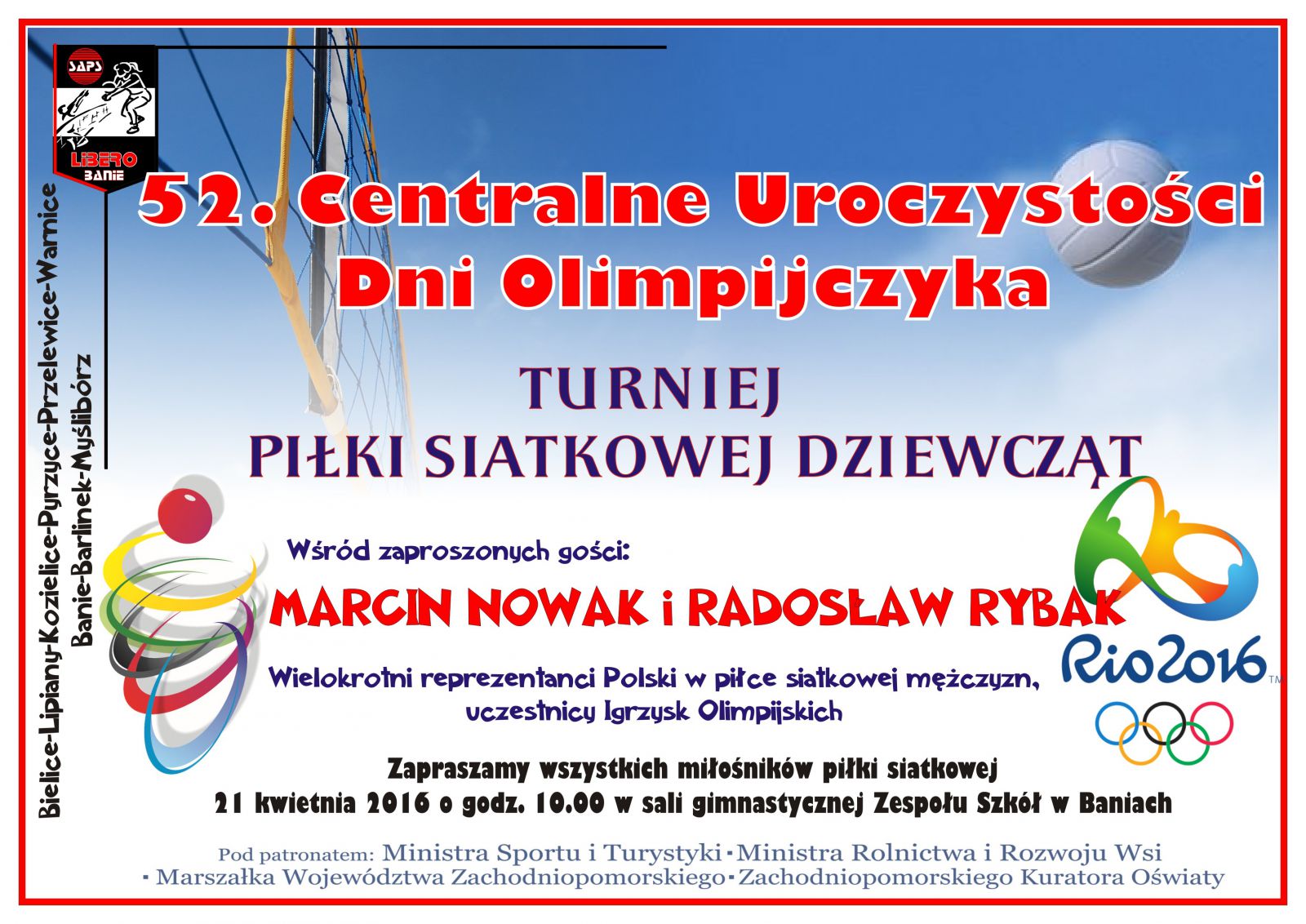 Ceremoniałem olimpijskim rozpoczęto w Baniach 52. Centralne Uroczystości Dni Olimpijczyka. Wśród zaproszonych gości byli obecni Wójt Gminy Banie Teresa Sadowska, Wicedyrektor Zespołu Szkół w Baniach Ewa Szostakowska, siatkarz Marcin Nowak uczestnik Igrzysk Olimpijskich w Atlancie, Członek Zachodniopomorskiej Rady Olimpijskiej Kazimierz Lipiński, Wiceprezes Klubu Olimpijczyka w Pyrzycach Józef Czaboćko oraz Prezes SAPS Libero Banie Andrzej Wołoszyn. Flagę olimpijską wniosły cztery wyróżniające się siatkarki rocznika 2004 i 2005.