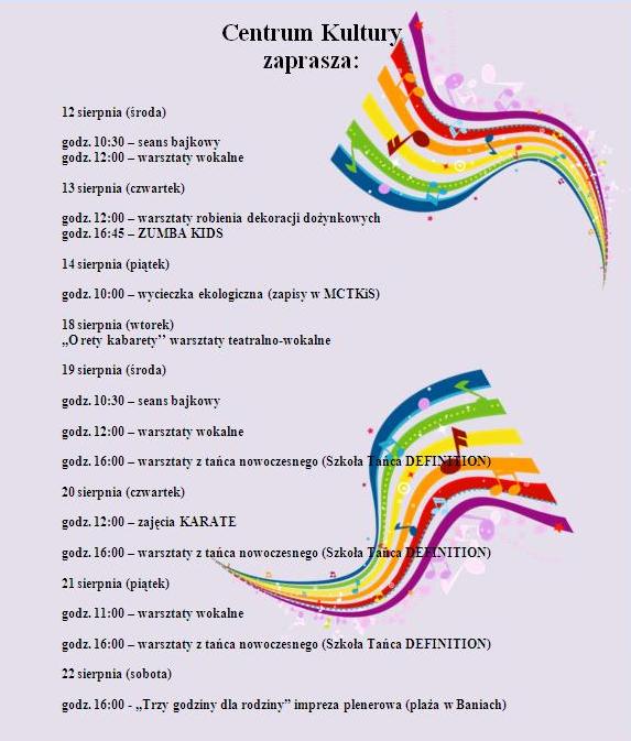 W dniu 7. sierpnia w MCTKiS w Baniach odbyły się zajęcia karate z udziałem dwóch prowadzących instruktorów ze Szczecina. Zajęcia cieszyły się dużym zainteresowaniem, uczestnicy poznali tajniki tej sztuki samoobrony, a Panowie prowadzący zachwyceni zdolnymi uczestnikami, już zapowiedzieli swój powrót na 20.08.2015r. ku wielkiej uciesze biorących udział w zajęciach dzieci. W godzinach popołudniowych miały miejsce warsztaty dekoracji potraw, na których można było nauczyć się, jak w prosty sposób z dostępnych na co dzień warzyw i owoców stworzyć przepiękne elementy dekoracji potraw. Wszyscy uczestnicy, łącznie z osobami dorosłymi biorącymi czynny udział w warsztatach, byli zachwyceni formą prowadzenia zajęć, a zdobyte umiejętności już wkrótce znajdą swój finał podczas rodzinnych posiłków.