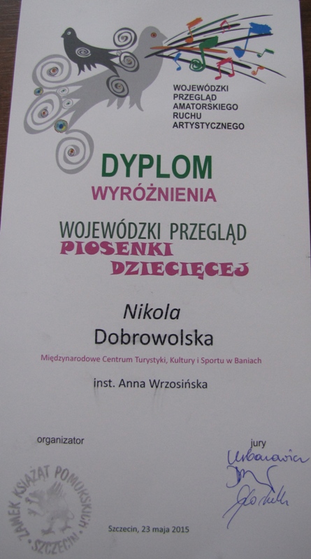 Wojewódzki Przegląd Piosenki Dziecięcej 2015, odbył się 23 maja na Zamku Książąt Pomorskich w Szczecinie. Gminę Banie, powiat gryfiński, Międzynarodowe Centrum Turystyki Kultury i Sportu w Baniach na Przeglądzie reprezentowała Nikola Dobrowolska. W przeglądzie udział wzięło 62 solistów i 3 zespoły wokalne.