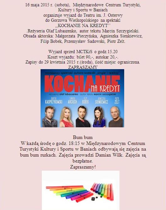 W każdą środę o godz. 18:15 w Międzynarodowym Centrum Turystyki Kultury i Sportu w Baniach odbywają się zajęcia na bum bum rurkach. Zajęcia prowadzi Damian Wilk. Zajęcia są bezpłatne.