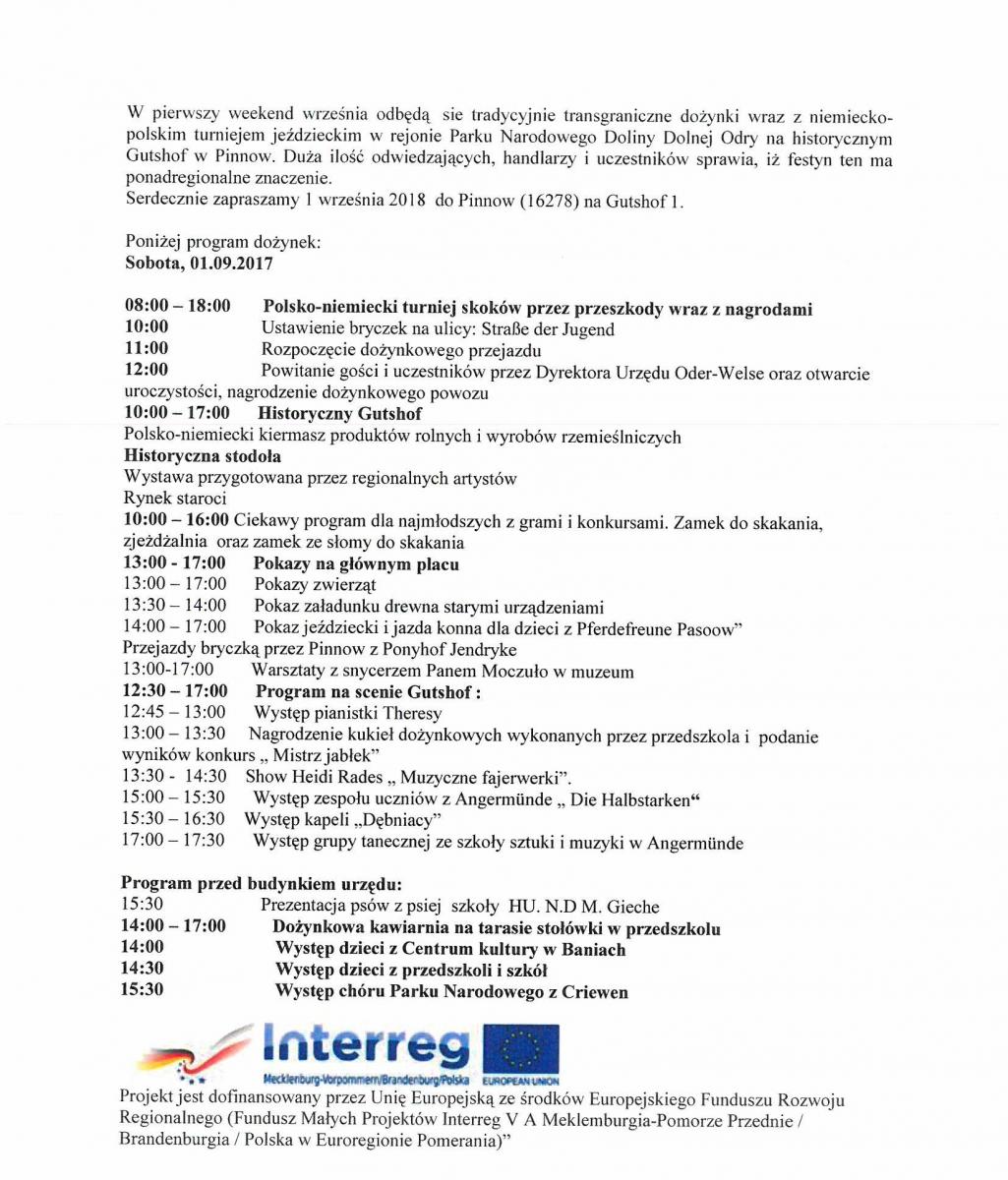 1 września w Pinnow odbyły się transgraniczne dożynki wraz z niemiecko-polskim turniejem jeździeckim w rejonie Parku Narodowego Doliny Dolnej Odry na historycznym Gutshof. W wydarzeniu udział wzięli mieszkańcy Gminy Banie. W programie artystycznym zaprezentował się zespół taneczny FLESZ DANCE SKIP z Centrum Kultury w Baniach.
