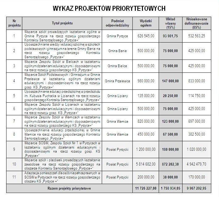 W ramach Koncepcji Kontraktu realizowanych będzie 11 zadań priorytetowych o szacunkowej łącznej wartości 11 726 227,00 zł w tym dofinansowanie w wysokości 9 967 292,95 zł. Pieniądze zainwestowane zostaną głownie w zwiększenie dostępu do opieki nad dziećmi, doskonalenie i rozwój kompetencji uczniów i nauczycieli oraz zwiększenie efektywności kształcenia zawodowego i dostosowanie go do potrzeb lokalnego rynku pracy.